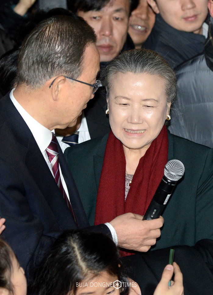 반기문 전 유엔 사무총장이 12일 오후 서울 동작구 사당동 자택 앞에서 아내 유순택 여사에게 마이크를 건네고 있다. 2017.01.12.