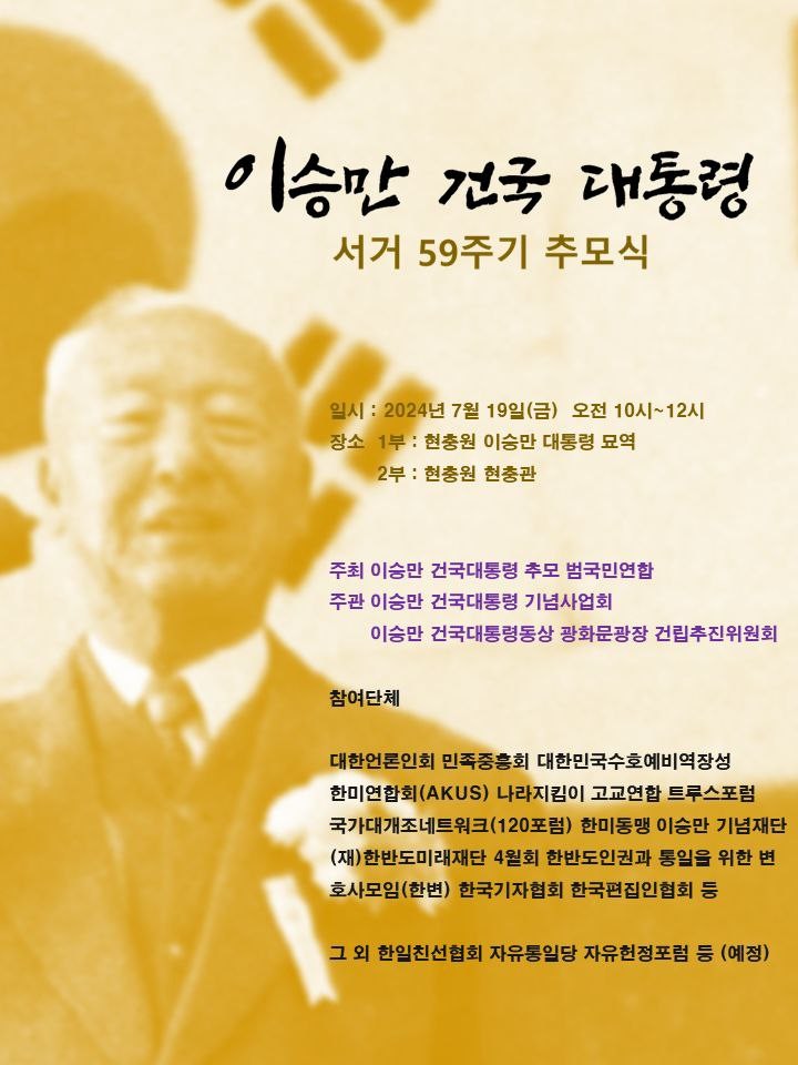 이달 19일 대한민국 건국대통령 이승만 박사 서거 59주기를 맞이해 현충원에서 서거 59주기 추모식이 진행될 예정이다.
