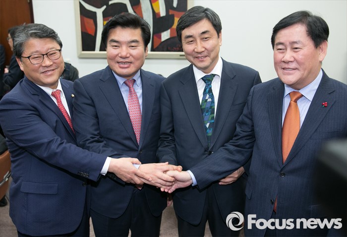 (서울=포커스뉴스) 여야 원내지도부와 최경환 경제부총리 겸 기획재정부 장관이 2일 오전 서울 여의도 국회에서 열린 예산안 및 법안 처리 관련 회담을 마친 뒤 취재진을 향해 포즈를 취하고 있다. 왼쪽부터 조원진 새누리당 원내수석부대표, 원유철 원내대표, 이종걸 새정치민주연합 원내대표, 최경환 부총리.