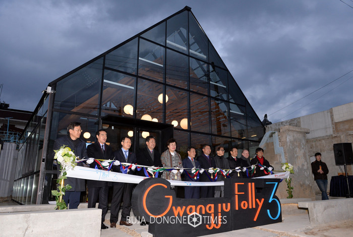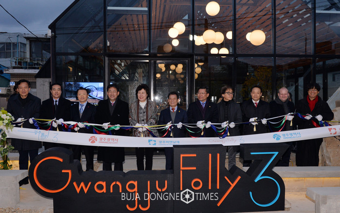 윤장현 광주광역시장이 10일 오후 동구 산수동에 들어선 광주폴리 3차 프로젝트 쿡(COOK) 폴리 개막식에 참석해 이은방 광주시의회 의장, 박양우 광주비엔날레재단 대표, 천득염 광주폴리시민협의회 회장, 천의영 제3차 광주폴리 총감독 등 주요 내빈들과 테이프커팅을 하고 있다
