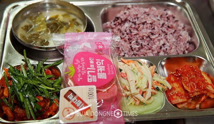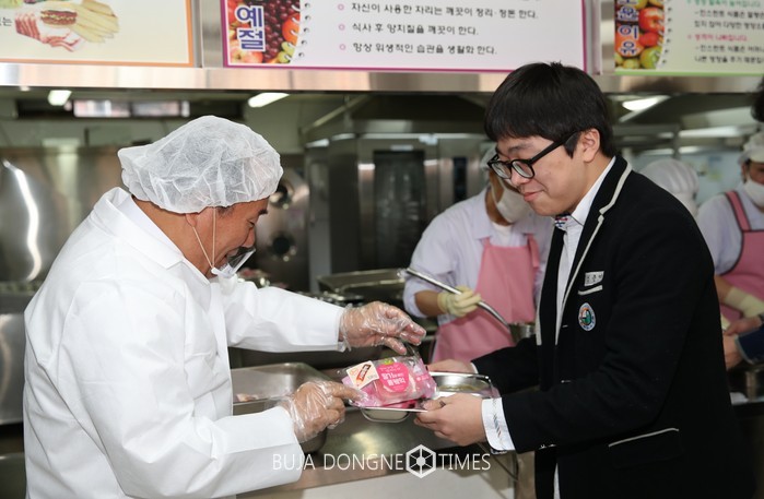 | △광덕고에서 수험생 격려를 위한 배식에서 광주시교육감이 학생들에게 배식한 음식의 모습이다. |
