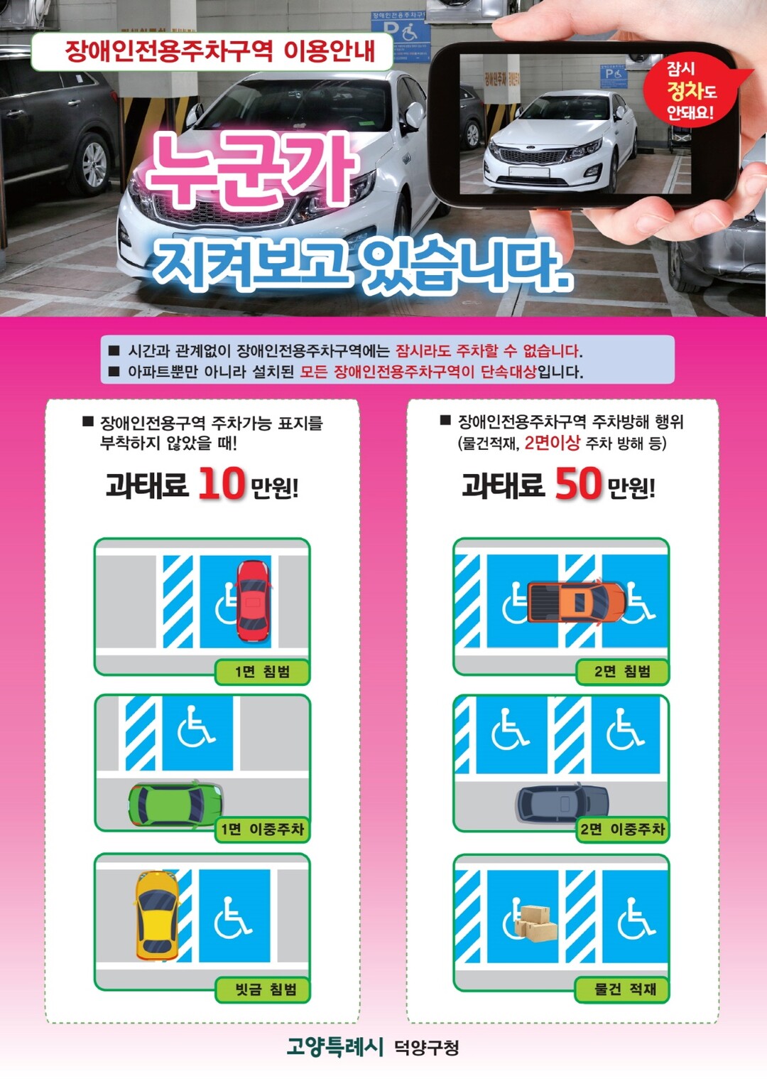 최근 장애인전용주차구역 위반 행위에 대한 ‘안전신문고’ 앱을 통한 신고가 지속되고 있다. 덕양구는 지속적인 시민인식 개선을 위해 전단, 현수막, 소셜미디어(SNS) 채널 등을 이용하여 집중 홍보에 나섰다.