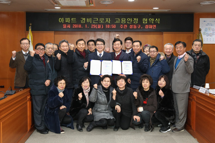 [부자동네타임즈 이병도 기자]성동구(구청장 정원오)는 성동구아파트입주자대표회의연합회(이하 성아연)와 지난 1월 29일 성동구청 8층 대회의실에서 ‘아파트 경비근로자와 상생하는 고용안정 협약’을 체결했다.