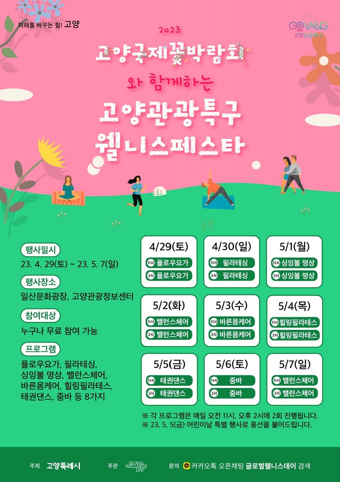 시 관계자는 “국내외 방문객에게 K-웰니스 중심도시로 발돋움하려는 고양시를 알리고 고양국제꽃박람회와 함께 쉼과 건강한 휴식 시간을 제공하려 한다.”고 밝혔다.