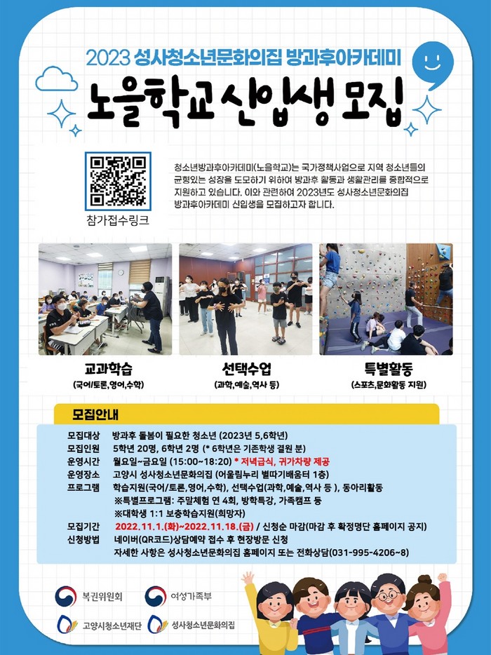 [부자동네타임즈 김인수기자] 고양시청소년재단(이사장 이동환) 성사청소년문화의집(센터장 이종순) 청소년방과후아카데미(노을학교)는 11월 1일부터 18일까지 2023년도 1차 신입생 모집한다.