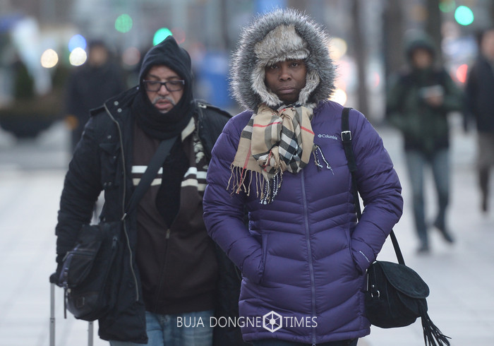 서울의 아침 최저 기온이 영하 8도를 기록하며 추위가 이어지고 있는 11일 오전 서울 중구 서울시청 인근에서 외국인 관광객들이 두꺼운 외투를 입고 이동하고 있다. 2017.01.11.