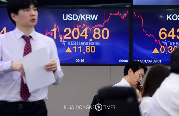 코스피지수가 개인과 외국인의 매수세에 힘입어 상승 출발한 뒤 2050선 초반에서 강보합세를 보이고 원·달러 환율은 9.0원 오른 1202.0원으로 개장한 9일 서울 중구 KEB하나은행 본점 딜링룸에서 딜러들이 업무를 보고 있다. 2017.01.09