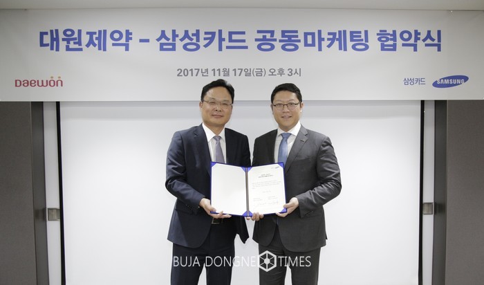 [부자동네타임즈 김현정 기자]대원제약(대표이사 부회장 백승열)과 삼성카드(대표이사 사장 원기찬)는 17일 서울 중구 삼성카드 본사에서 업무 제휴 협약을 체결하고 향후 빅데이터 및 디지털을 기반으로 한 공동마케팅을 함께 전개해 나가기로 하였다.