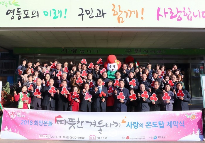 영등포구(구청장 조길형)는 20일 ‘사랑의 온도탑’ 제막식을 개최하고 연말연시 어려운 이웃을 돕기 위한 『2018 희망온돌 따뜻한 겨울나기』모금 사업에 본격적으로 돌입했다고 밝혔다.