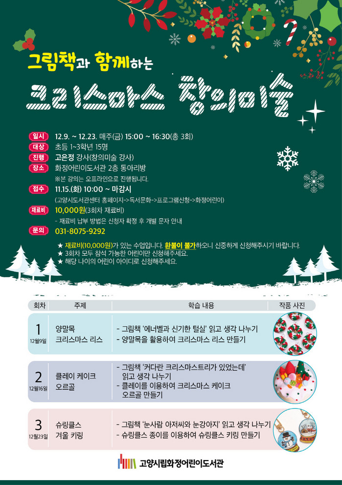 [부자동네타임즈 김인수기자] 고양특례시(시장 이동환) 화정어린이도서관이 크리스마스를 맞아 초등학교 1~3학년을 대상으로 12월 9일부터 12월 23일까지 매주 금요일 그림책과 함께하는 크리스마스 창의미술을 운영한다.