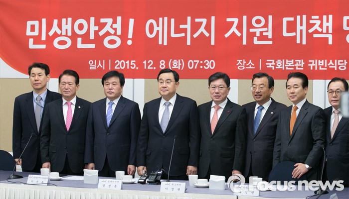 (서울=포커스뉴스) 8일 오전 서울 여의도 국회에서 열린 '민생안정! 에너지 지원대책' 당정협의회에 김정훈(왼쪽 네번째) 새누리당 정책위의장과 윤상직(왼쪽 다섯번째) 산업통상자원부 장관, 이정현(오른쪽 세번째) 최고위원 등이 기념사진을 찍고 있다.