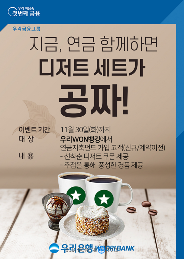[부자동네타임즈 이현재 기자]우리금융지주의 자회사 우리은행은 연말정산을 미리 준비하는 고객을 위해‘지금, 연금 함께하면 디저트 세트가 공짜’이벤트를 11월 30일까지 실시한다고 8일 밝혔다.