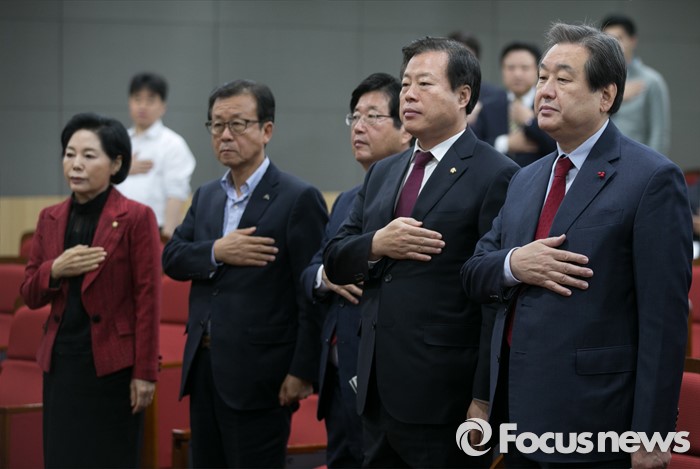 (서울=포커스뉴스) 10일 오전 서울 여의도 국회 의원회관에서 열린 퓨처라이프 포럼에 참석한 김무성(오른쪽부터) 새누리당 대표, 이한성, 강길부 의원, 원혜영 새정치민주연합 의원, 류지영 의원이 국기에 대한 경례를 하고 있다.