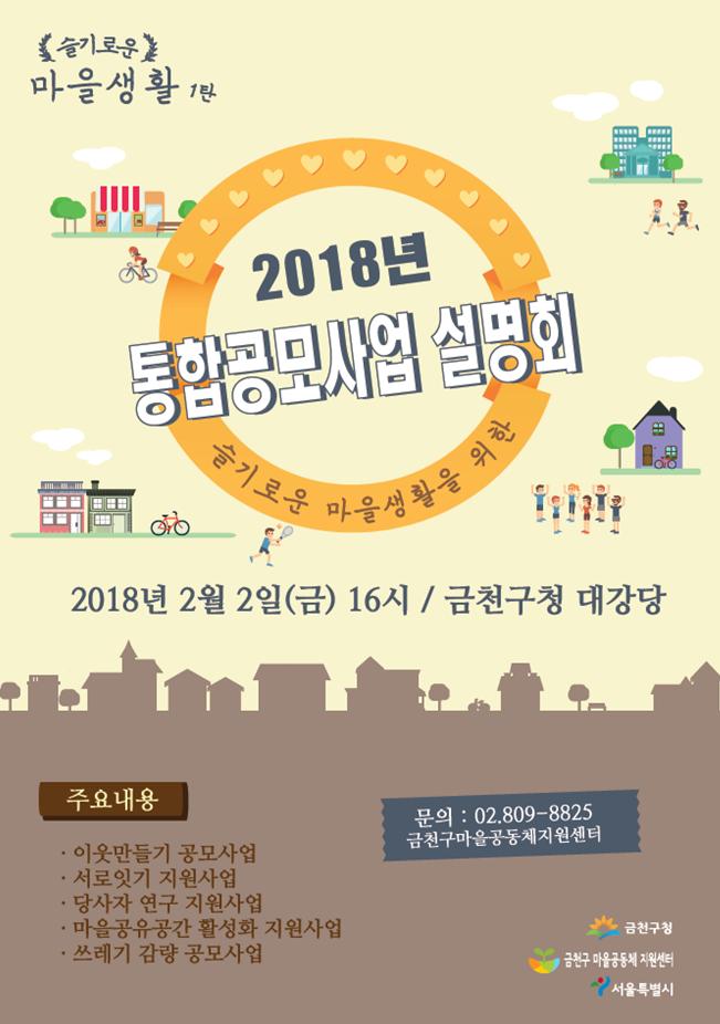 [부자동네타임즈 이병도 기자]금천구(구청장 차성수)가 2월 2일(금) 오후 4시 금천구청 대강당에서 마을공동체 활성화를 위한 ‘2018년 마을공동체 통합공모사업 설명회’를 개최한다.
