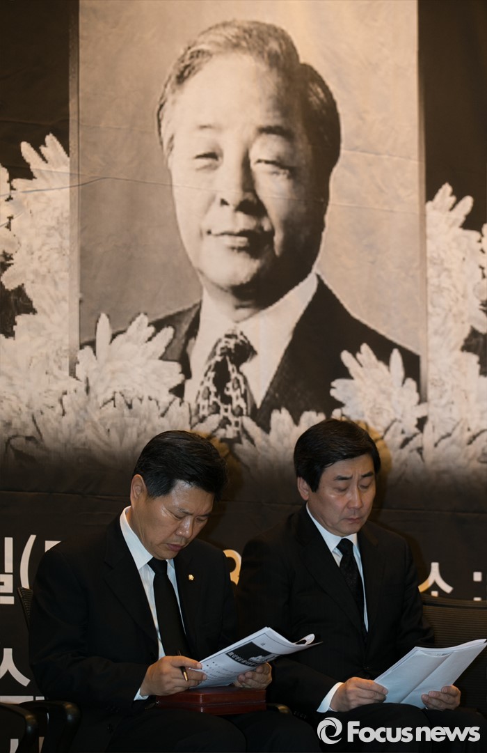 (서울=포커스뉴스) 26일 오전 서울 여의도 국회도서관에서 열린 故 김영삼 전 대통령 추모 예배에 참석한 홍문종(왼쪽) 새누리당 의원, 이종걸 새정치민주연합 원내대표가 기도를 하고 있다.