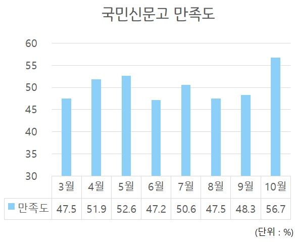 시의 국민신문고 민원처리에 대한 시민만족도 조사 결과를 나타내는 만족도는 올해 들어 가장 크게 상승하였다. 10월 만족도는 전월보다 8.4% 상승한 56.7%를 기록했다. 참고로 2023년 기초자치단체 평균 만족도는 51.98%이며, 고양시의 지난 평균 3년 만족도는 44.04%였다.