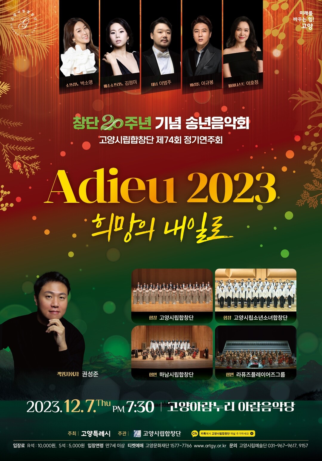 [부자동네타임즈 = 김인수 기자] 다채로운 공연과 연주로 고양특례시(시장 이동환)를 대표하는 문화사절단 고양시립합창단이 2023년 12월 7일(목) 오후 7시 30분 고양아람누리 아람음악당에서 제74회 정기연주회 ‘아듀(Adieu) 2023 희망의 내일로’를 개최한다.