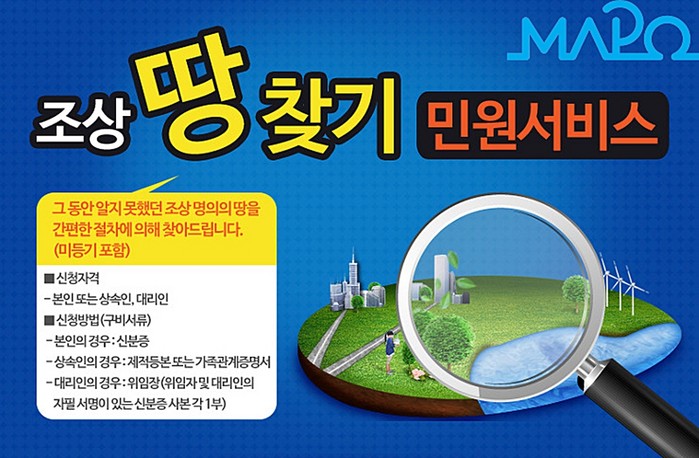 ‘조상 땅 찾아주기’ 행정서비스와 관련한 기타 자세한 문의는 마포구 부동산정보과 으로 하면 된다.