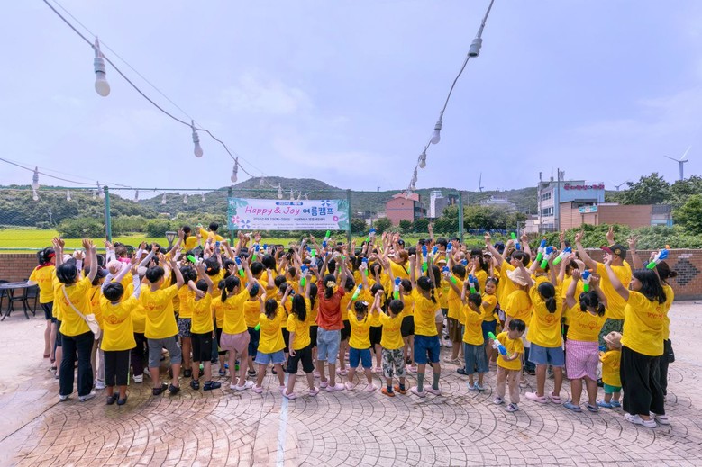 | ▲'2024 제9회 Happy & Joy 여름 캠프' 참여한 아이들과 단체사진을 찍고 있다. |