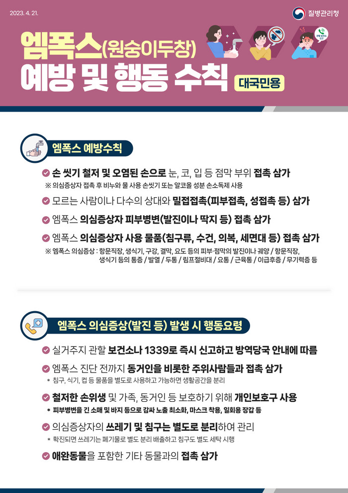 보건소 관계자는 “엠폭스 감염 예방을 위해 모르는 사람들과의 밀접접촉을 피하고 생활 속 손 씻기를 철저히 지켜야 한다.”며 “의심 증상 발생 시 보건소 또는 질병관리청(1339)에 곧바로 신고해주시기 바란다.”고 당부했다.