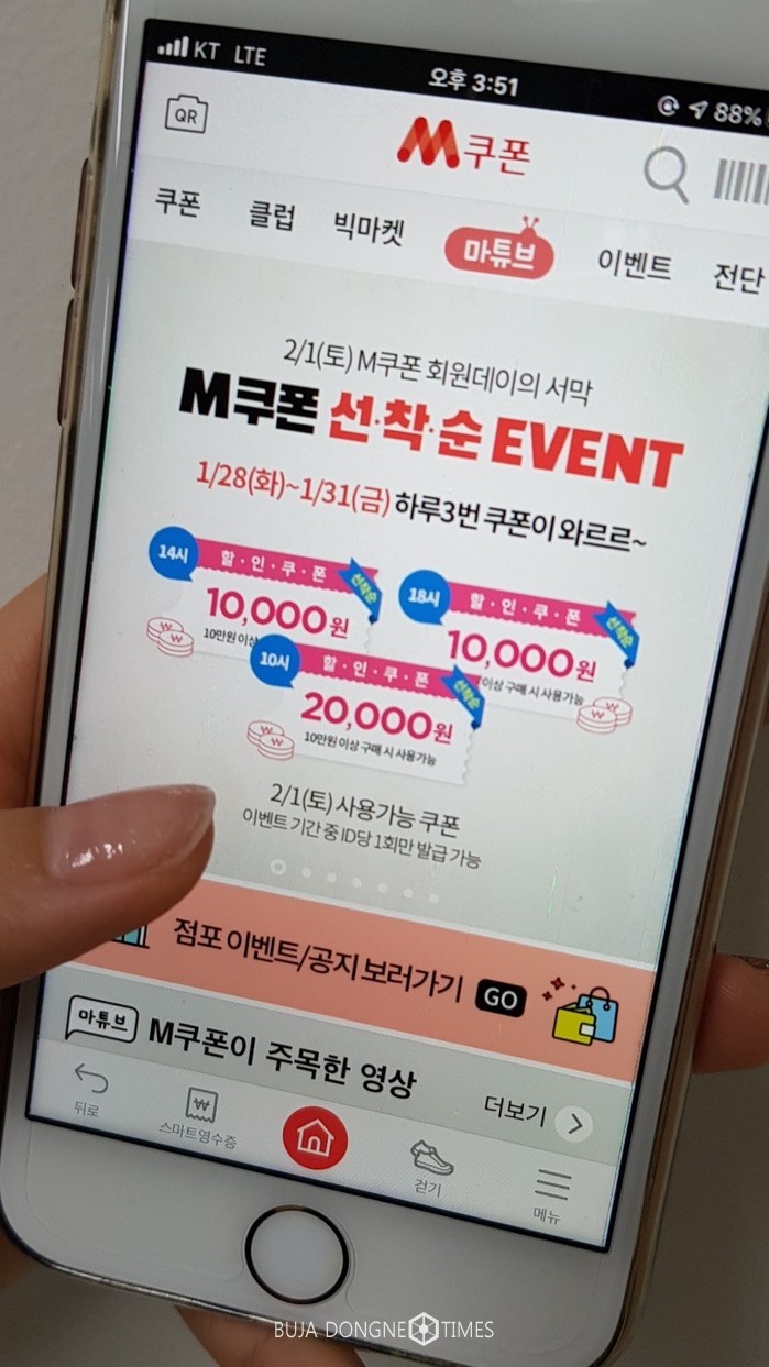 2월 1일 ‘M쿠폰 회원 데이’의 일환으로 1월 31일(금)까지 매일 10시, 14시, 18시에 M쿠폰 앱을 접속하면 선착순 이벤트에 응모할 수 있다. 매일 오전 10시에는 5천명 한정으로 2만원 할인 쿠폰이, 14시, 18시에는 각 1만명 한정으로 1만원 할인 쿠폰이 각각 지급된다. (※ 해당 기간 중 이벤트는 회원당 1회만 참여 가능하며, 금액 할인 쿠폰은 10만원 이상 구매 시 사용가능) 해당 쿠폰은 2월 1일(토) 단 하루만 오프라인 매장에서 사용 가능하다.