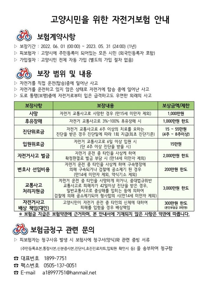고양시민이라면 누구나 별도의 가입 절차 없이 자전거 이용 보험이 적용된다. 보험은 자전거 사고로 발생한 사망, 후유 장애, 진단·입원비, 배상·벌금 등에 대해 보장하고 있다. 자전거 사고 발생 시 고양시 민원콜센터 또는 ㈜KB손해보험 자전거보험접수센터로 문의하면 된다.