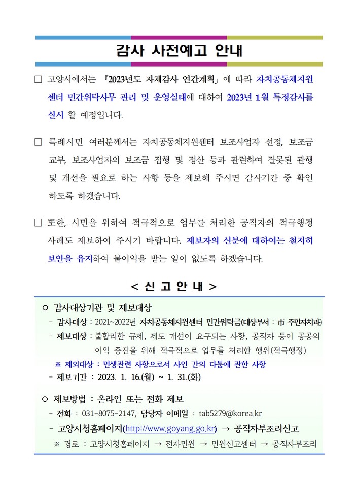 [부자동네타임즈 김인수기자] 고양특례시는 2023년 1월부터 3월까지 고양시 자치공동체지원센터를 대상으로 민간위탁사무 특정감사를 실시한다.
