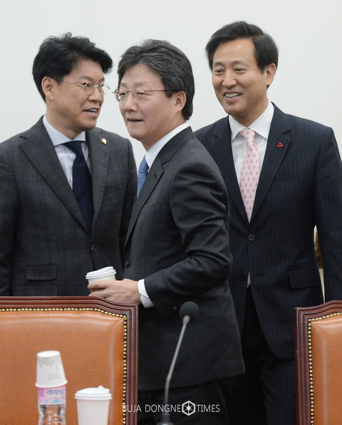 바른정당 유승민(가운데) 의원이 2일 서울 여의도 국회에서 열린 최고위원회의에 참석하며 오세훈(오른쪽) 최고위원을 지나쳐가고 있다. 2017.02.02.