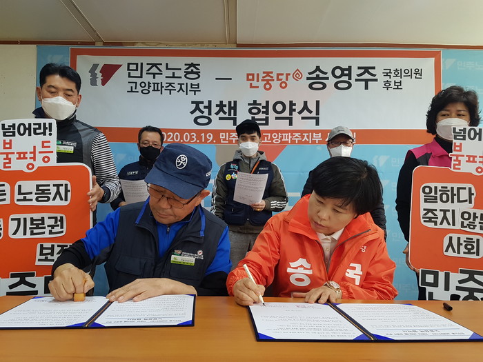 [부자동네타임즈 김인수기자] 민중당 송영주 후보는 지난 19일 전국민주노동조합총연맹 고양파주지부(지부장 안재성)와 정책협약식을 맺었다.