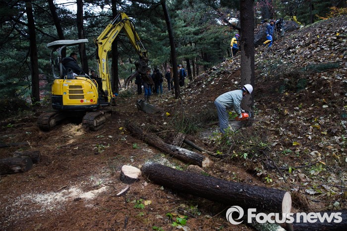 (서울=포커스뉴스) 23일 오전 서울 동작구 국립현충원 제3장군묘역 인근에서 인부들이 김영삼 전 대통령의 묘자리를 만들기 위해 작업하고 있다.