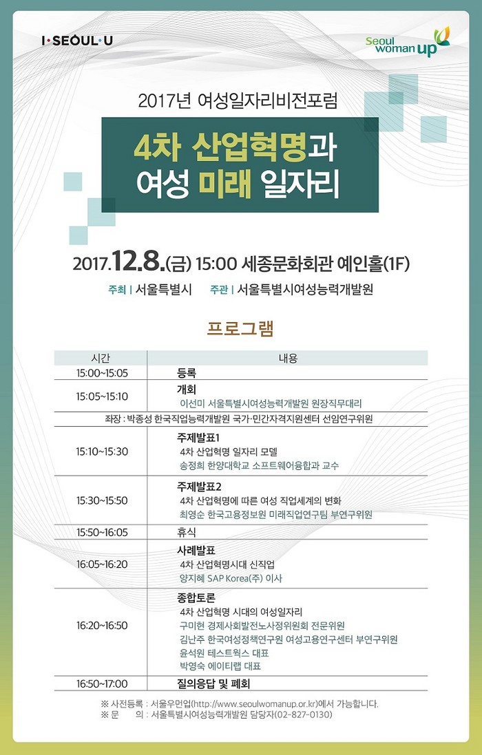 이번 포럼은 ‘4차 산업혁명과 여성 미래 일자리’를 주제로, 서울시여성능력개발원의 주관으로 열린다. 특히 4차 산업혁명 시대의 일자리 모델과 여성 직업세계의 변화에 대해 살펴보고, 실제 4차 산업혁명의 일자리 모델 사례를 공유한다.