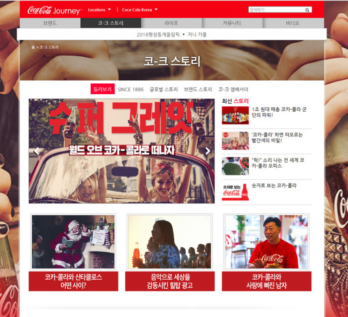 [부자동네타임즈 김현정 기자]코카-콜라 저니’에서는 브랜드 비하인드 스토리를 비롯해, 마케팅 캠페인, 지속 가능한 경영과 혁신을 위한 노력, 트렌드와 사회 현상에 대해 코카-콜라의 철학으로 전달한다. 글로벌 코카-콜라는 지난 2012년, 회사 홈페이지를 디지털 매거진 형태로 전환한 ‘코카-콜라 저니’를 오픈하며 본격적인 브랜드 저널리즘의 세계로 뛰어든 이후, 현재 독일, 이탈리아, 중국, 호주 등 전 세계 40여 개 사이트로 확대해 22개의 언어로 짜릿한 소통에 나서고 있다.