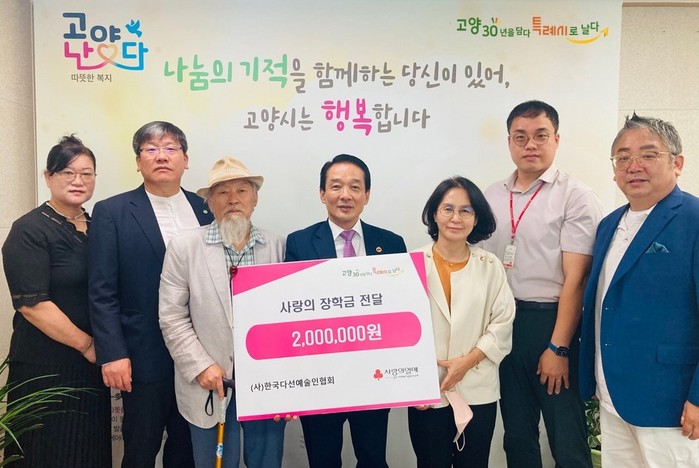 [부자동네타임즈 김인수기자] 고양특례시는(시장 이동환) 사단법인 한국다선예술인협회에서 사랑의 장학금 200만원을 기탁해 전달식을 진행했다고 19일 밝혔다. 이번에 전달된 장학금은 경기사회복지공동모금회를 통하여 관내 저소득층 가정 학생들에게 지원될 예정이다.