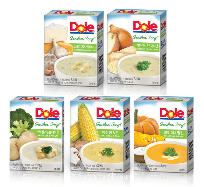 스프는 미국, 유럽 등지에서 가벼운 식사 메뉴나 에피타이저로 널리 사랑 받는 음식이다. DOLE(돌)이 선보인 ‘돌 가든스프’는 야채, 치즈 등 신선한 원재료를 사용하여 스프의 진한 풍미와 풍부한 식감을 느낄 수 있는 제품이다. 1인분씩 담긴 파우치 타입의 소포장으로 출시되어 뜨거운 물만 부으면 간편한 아침 식사로 활용이 가능하다. 로스티드갈릭&까망베르치즈, 브로컬리&포테이토, 파마산치즈&어니언, 머쉬룸&콘, 크리미&펌킨 총 5가지 종류로 구매할 수 있다. 편리한 섭취 및 보관방법으로 바쁜 직장인들을 위한 아침 식사나 간식으로 적합하며, 어린 자녀들의 간식으로도 좋다.