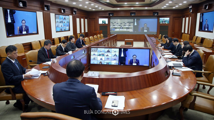 홍윤식 행정자치부 장관이 27일 오전 서울 종로구 정부서울청사 영상회의실에서 열린 제4차 지역경제협의회에서 17개 시·도 경제 담당 부단체장들에게 영상회의를 통해 인사말을 하고 있다. 2017.02.27. (사진=행정자치부 제공)