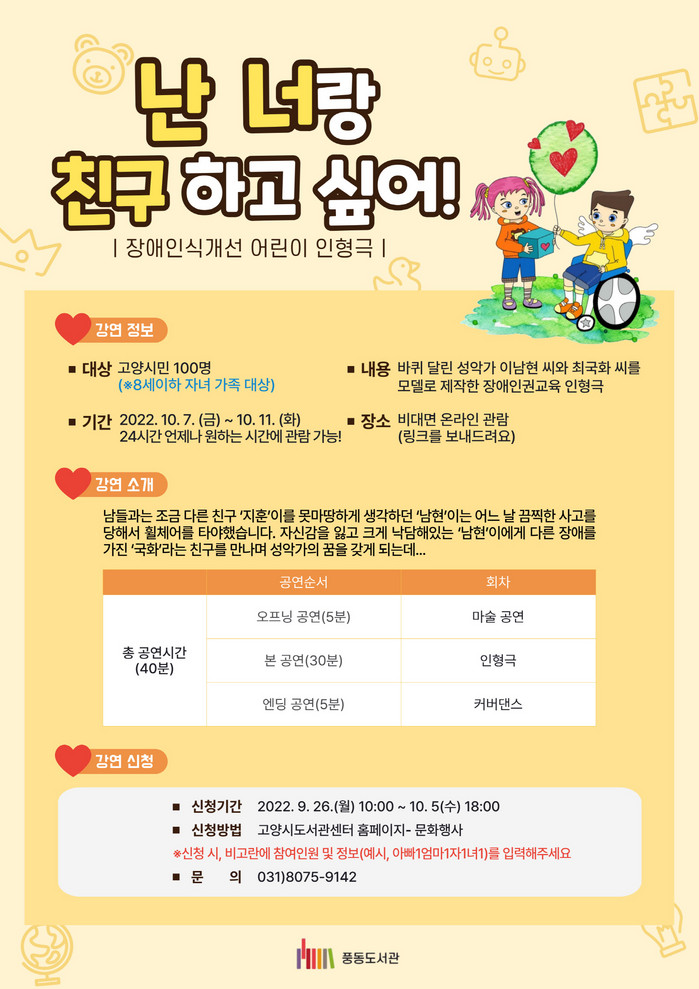 [부자동네타임즈 김인수기자] 고양시(이동환 시장) 풍동도서관은 오는 10월 7일(금)부터 10월 11일(화)까지 총 5회에 걸쳐 고양 시민 100명(※8세 이하 자녀 가족)을 대상으로 온라인 어린이 인형극을 진행한다.