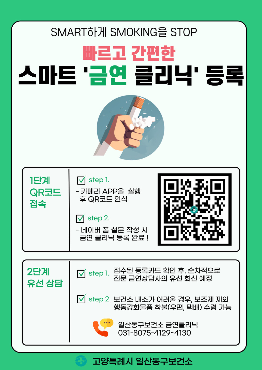 [부자동네타임즈 = 김인수 기자] 고양특례시 일산동구보건소 금연클리닉에서는 큐알(QR)코드를 활용한 빠르고 간편한 ‘스마트 금연 등록 시스템’을 운영하고 있다.