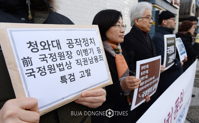 참여연대, 민주사회를 위한 변호사 모임 등 진보단체 회원들이 6일 오전 서울 강남구 대치동 특검 사무실 앞에서 '불법사찰·공작정치 동원 국정원을 수사하라' 국정원 고발 기자회견을 하고 있다. 참석자들은 고 김영한 전 청와대 민정수석의 업무일지를 통해 드러난 국가정보원이 고위공직자 및 정치인, 종교인, 민간인 등을 불법 사찰한 정황에 대해 이병기 전 국정원장 등을 국가정보원법상 직권남용죄 위반혐의로 특검에 고발한다고 밝혔다. 2017.02.06.