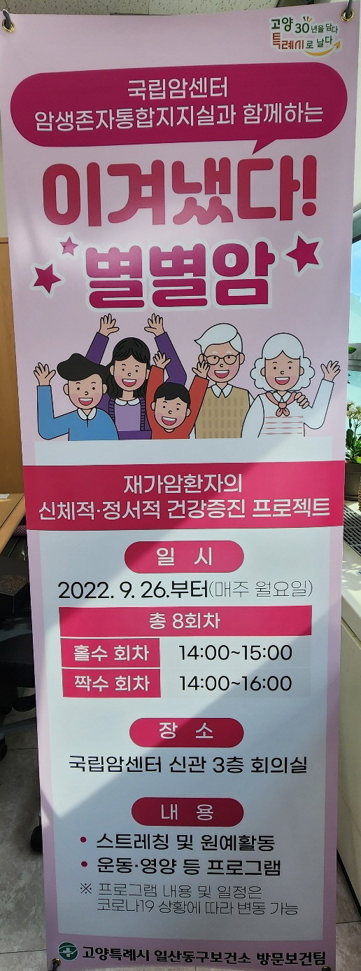 [부자동네타임즈 김인수기자] 고양특례시(시장 이동환) 일산동구보건소는 9월 26일부터 재가암환자를 대상으로 한 ‘이겨냈다! 별별암’ 프로그램을 시작한다고 밝혔다.