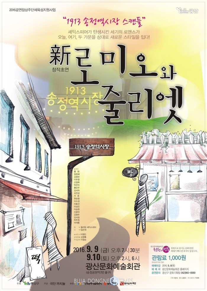 9일 오후 7시30분, 10일 오후 2시와 6시에 각각 막을 올리는 이번 공연은 광산문예회관 상주단체 극단 까치놀의 창작초연 작품을 셰익스피어가 쓴 세기의 로맨스 '로미오와 줄리엣'을 1913 송정역시장을 배경으로 각색한 작품이다.
