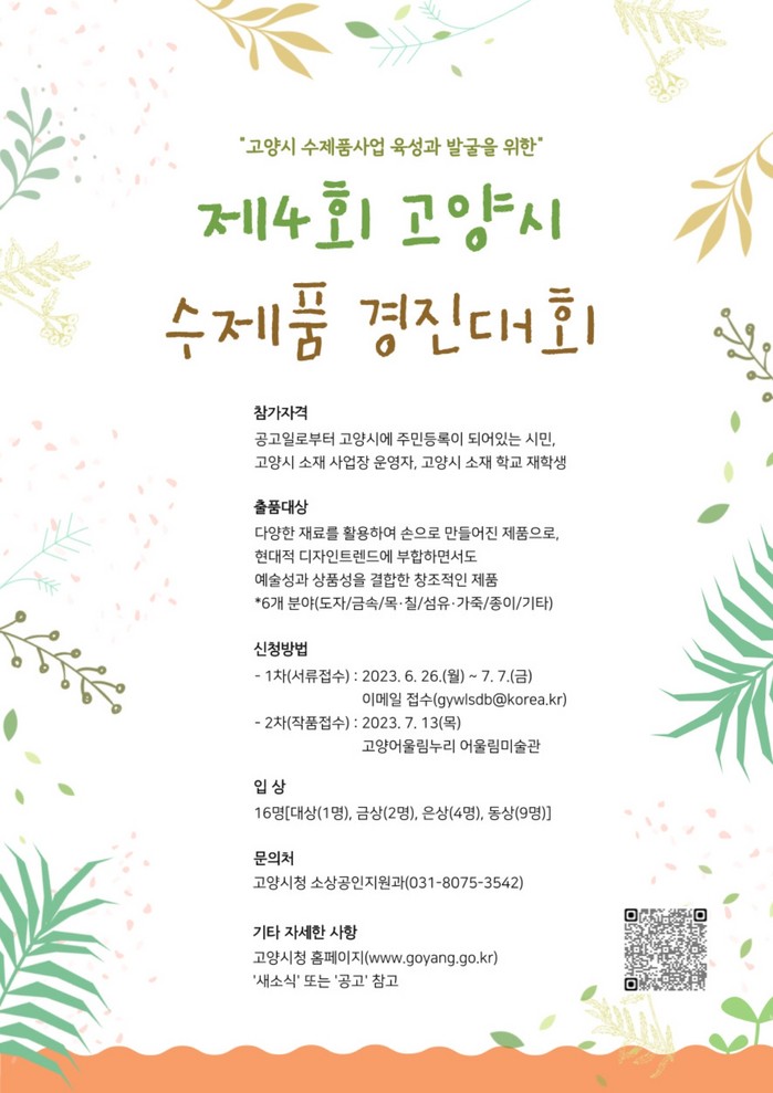 입상자에게는 ‘K-핸드메이드페어’ 입점 지원 혜택을 제공한다. 자세한 내용은 고양시청 홈페이지 공고문을 참고하거나 소상공인지원과로 문의하면 된다.