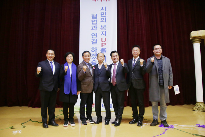 [사진설명] 안운섭 민선 2기 회장과 국회의원 및 시의원이 기념 촬영을 하고 있다.