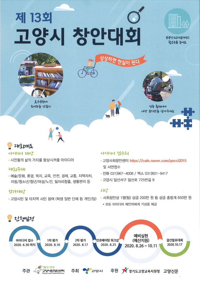 고양시가 주최하고 고양사회창안센터(대표 심욱섭)가 주관하는 이번 공모전은 경제 ‧ 문화 ‧ 복지 ‧ 안전 등 여러 분야에 걸친 자유 주제로 실시되며, 평소 일상생활에서 느꼈던 문제에 대한 창의적인 개선 방안이나 살기 좋은 지역사회 만들기에 꼭 필요한 제도 등 시정 전반에 대한 아이디어를 접수한다.