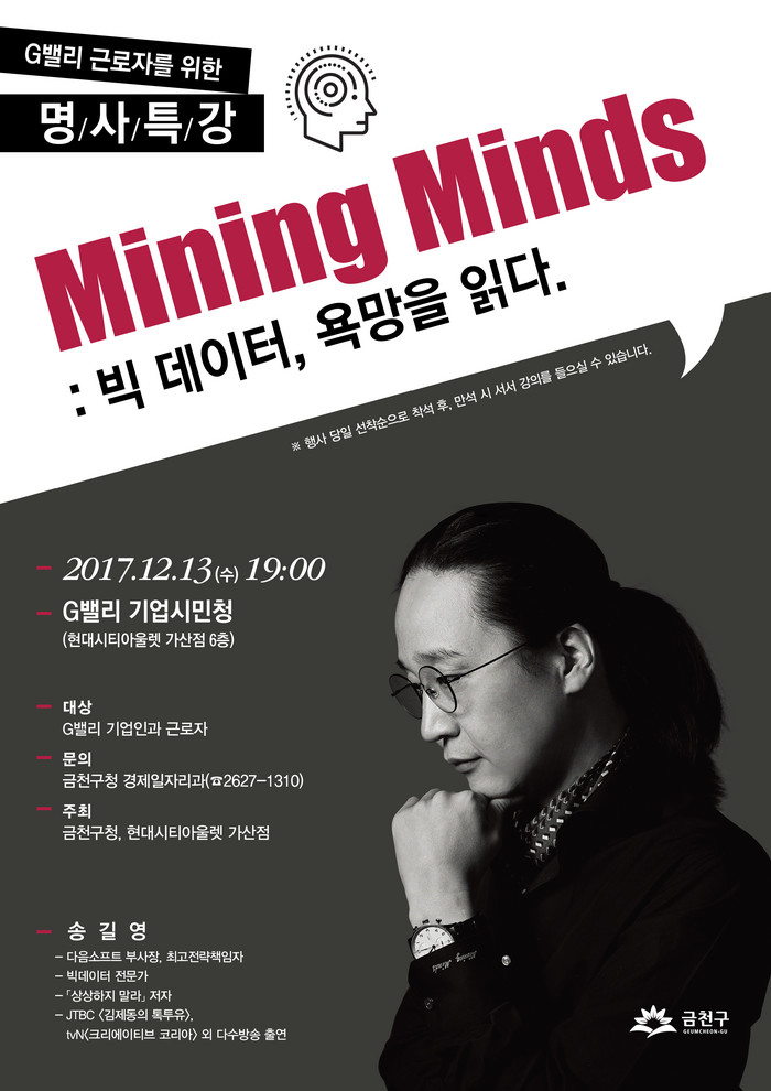 [부자동네타임즈 이병도 기자]금천구(구청장 차성수)는 12월 13일(수) 오후 7시 G밸리 기업시민청(가산동 디지털로10길 9, 현대아울렛 6층)에서 다음소프트 송길영 부사장을 초청해 ‘Mining Minds : 빅데이터 욕망을 읽다’라는 주제로 명사 특강을 개최한다.