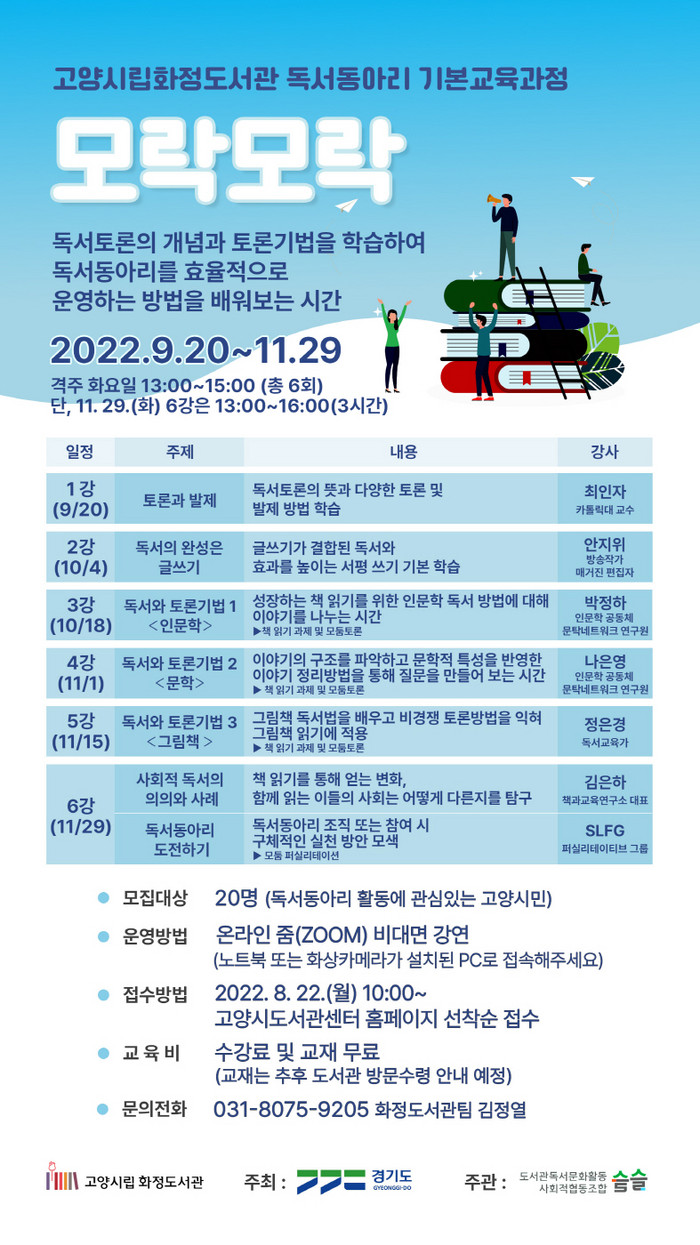 참여 신청은 8월 22일(월) 10시부터 고양시 도서관센터 홈페이지를 통해 신청할 수 있다. 기타 자세한 사항은 화정도서관으로 문의하면 된다.