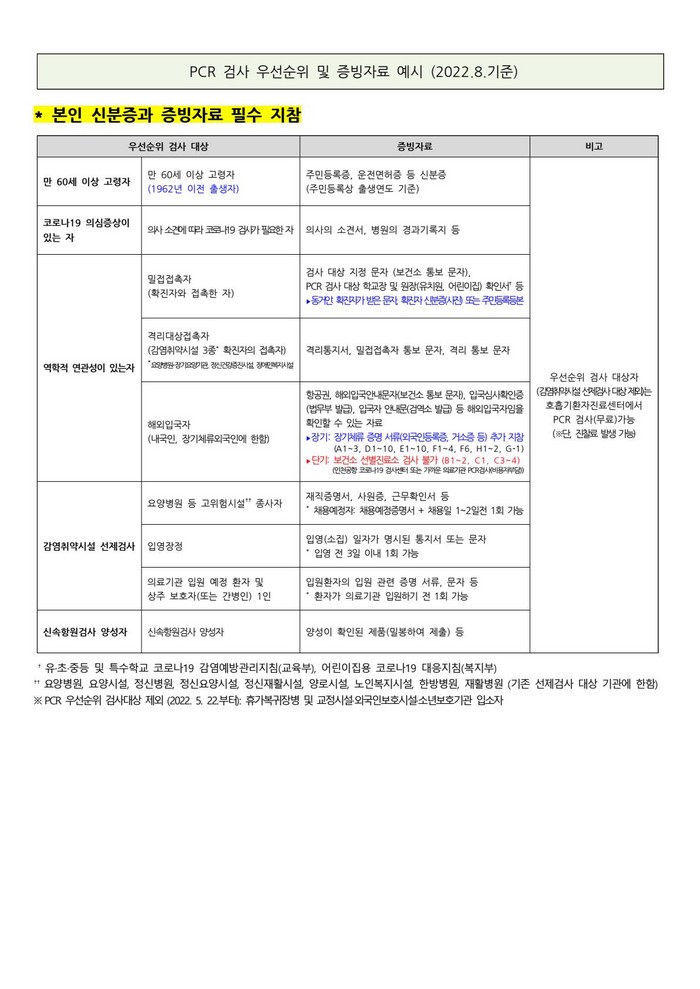 검사 대상은 만 60세 이상 고령자, 의료기관 내 의사소견에 따라 코로나19 검사가 필요한 자, 확진자 동거가족 등 역학적 연관성이 있는 자, 신속항원 검사 양성자, 해외입국자 등 PCR우선순위 대상자이다.