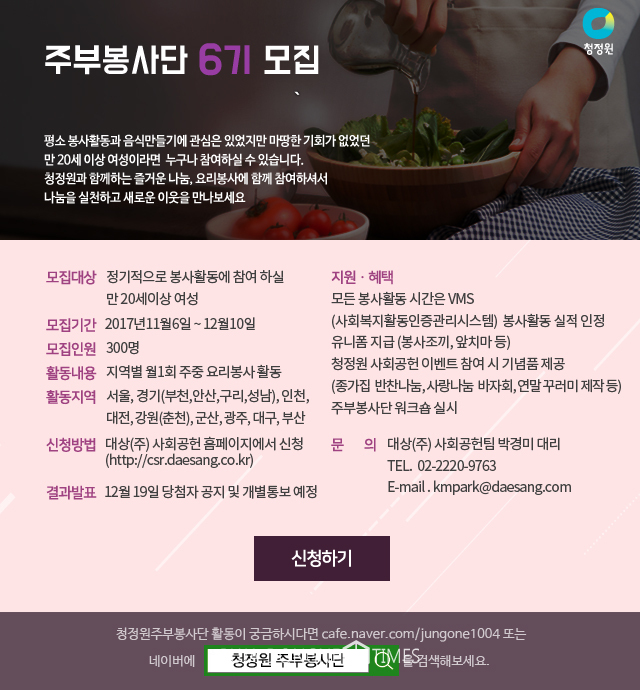 [부자동네타임즈 김현정 기자]대상(주)이 12월 10일까지 '청정원 주부봉사단' 6기를 모집한다. 이번에 선발하는 인원은 총 300명이며 내년 1년 동안 대상이 진행하는 다양한 봉사활동에 참여하게 된다.
