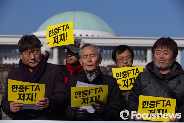 (서울=포커스뉴스) 30일 오전 서울 영등포구 국회 정문 앞에서 농민의 길, 환경농업단체연합회, 우리 밀 살리기 운동본부의 주최로 한, 중 FTA 국회비준 반대 농민 기자회견을 하고 있다.