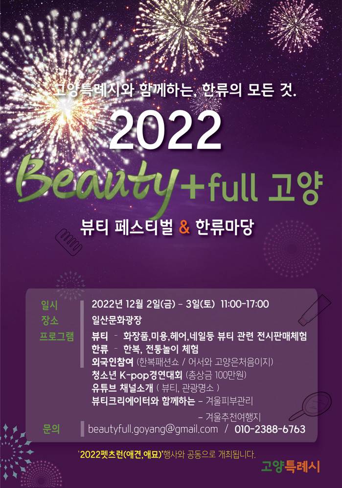 [부자동네타임즈 김인수기자] 고양특례시(시장 이동환)가 오는 12월 2일부터 3일까지 고양관광특구 일산문화광장에서 뷰티 테마 한류 페스티벌 ‘2022 뷰티풀(Beauty Full) 고양’을 개최한다.