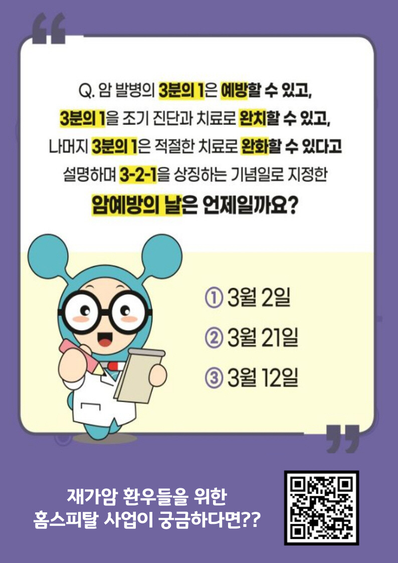 이번 캠페인에서는 국민 암 예방 10대 수칙과 암 예방 오/엑스(O/X) 퀴즈 등을 안내하고 암생존자(재가암환자)를 대상으로 진행하는 ‘찾아가는 홈스피탈’ 사업에 대해 홍보할 예정이다.